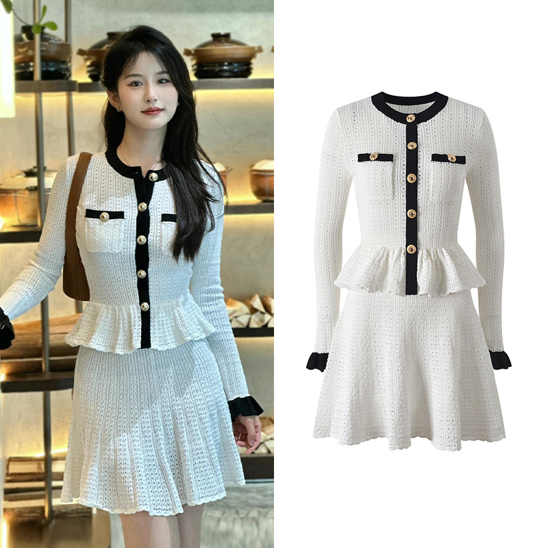 Elegant Hit Color Ruffles Knitting Sweater Dresses For Women, New Autumn Flare Sleeves, Patchwork White Party Dress Robe black s