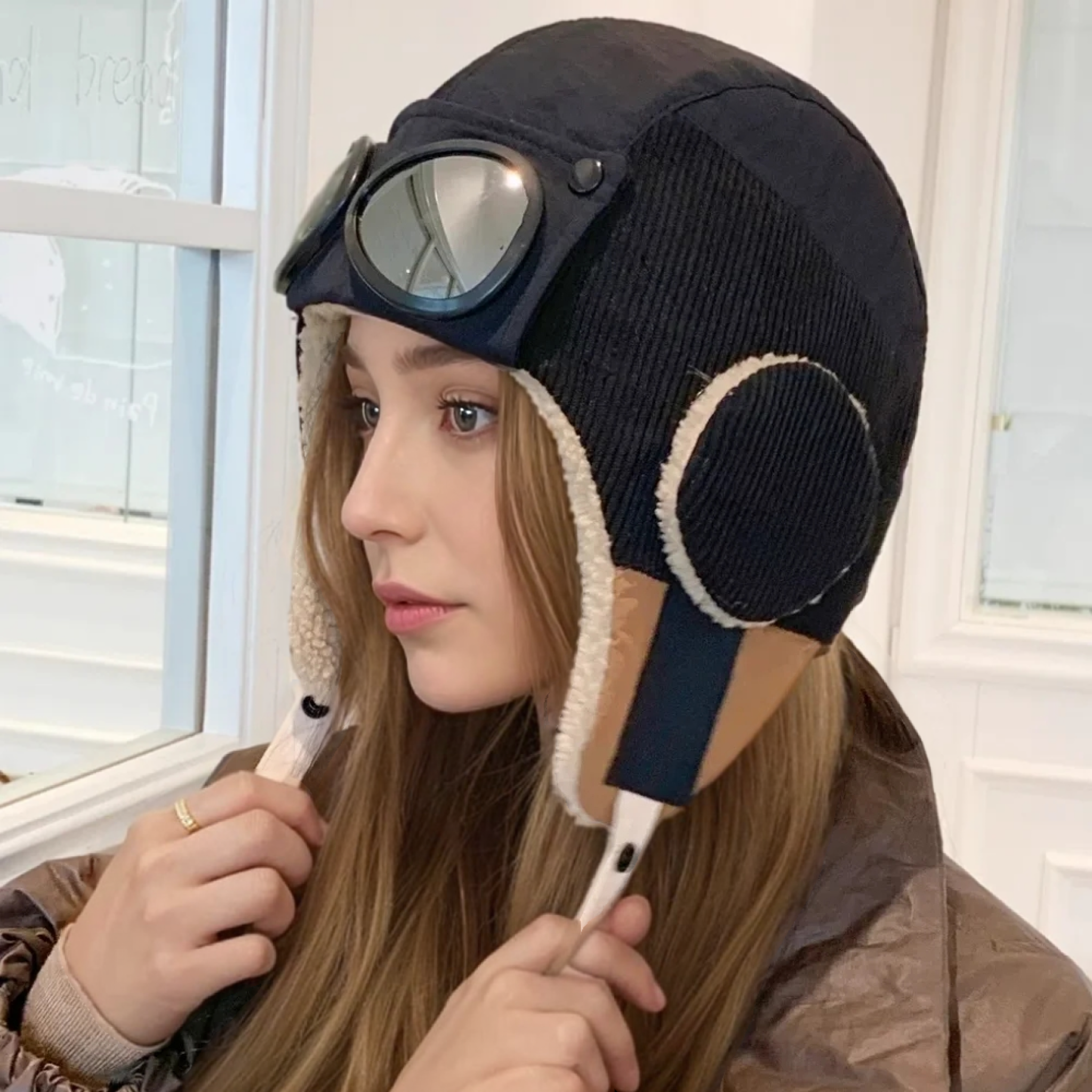 Winter Hat For Women, Warm Bomber Cap With Earflap, Plush Fur Dandy Hat With Goggles. khaki