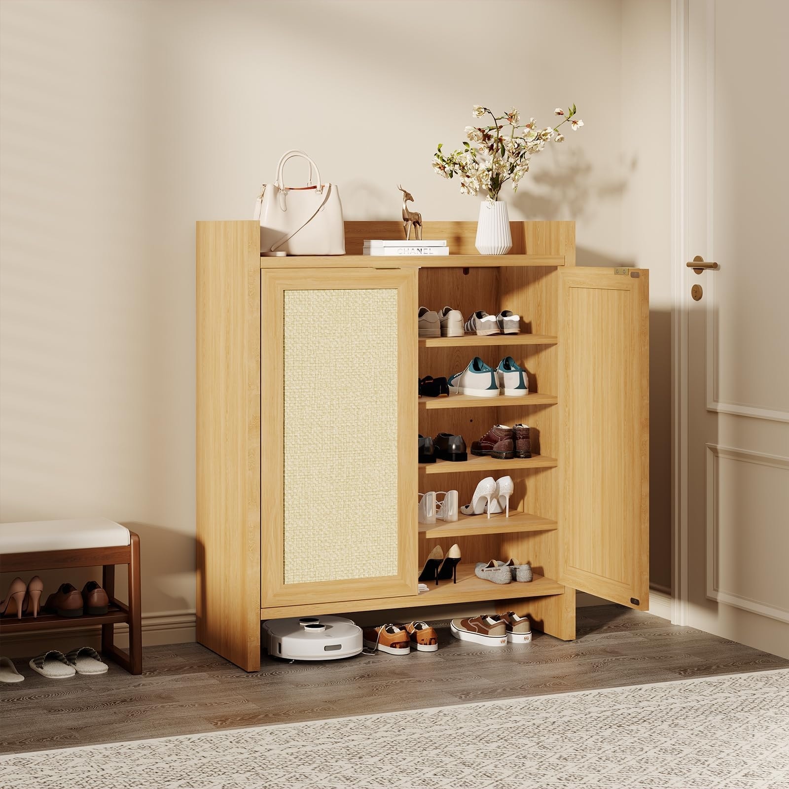 Rattan Shoe Cabinet, 5-Tier Farmhouse Boho Shoe Storage Organizer with Adjustable Shelves