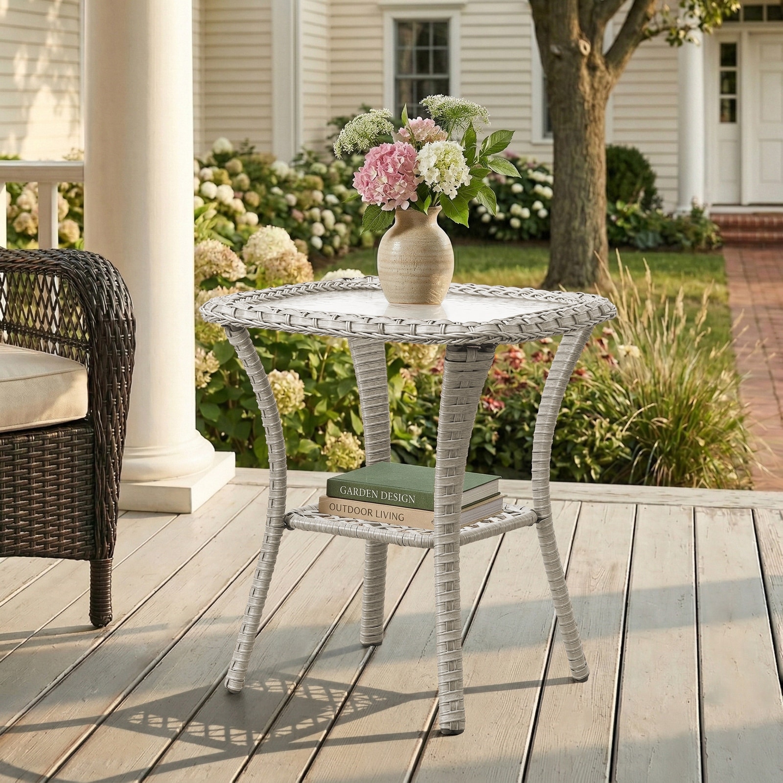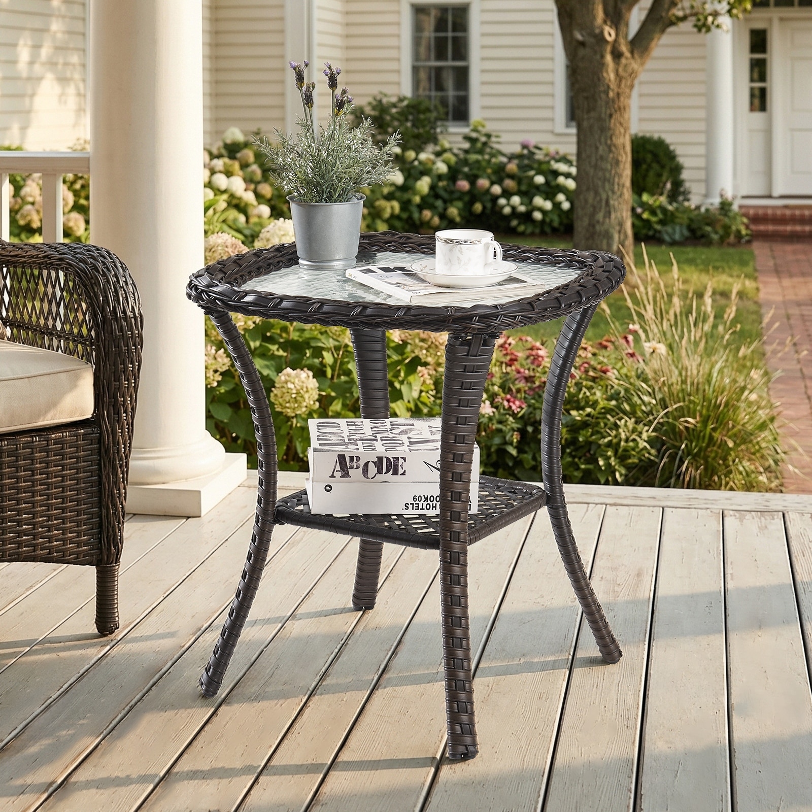 Meyreso 20"L x 20"W x 22"H Outdoor Wicker Side Table with Tempered Glass Top & Storage Shelf.