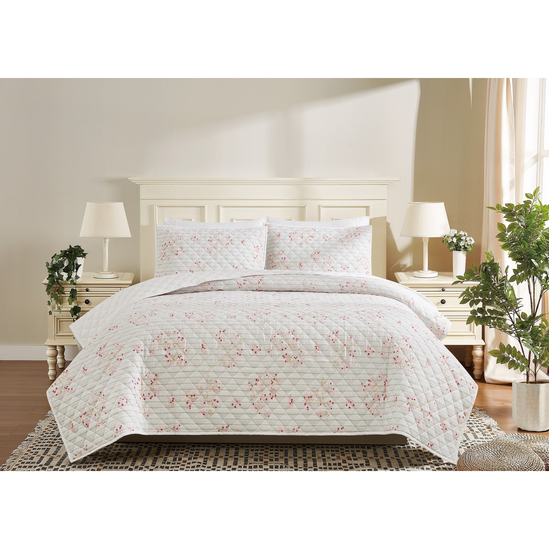 Linery & Co. Cotton Stitched Reversible Floral 3 Piece Scalloped Quilt and Sham Set