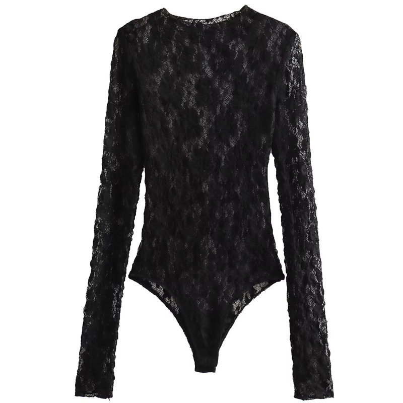 Sexy Black Lace Bodysuit For Women, Chic Hollow Out Design, Long Sleeves, High Spandex Lingerie black xs