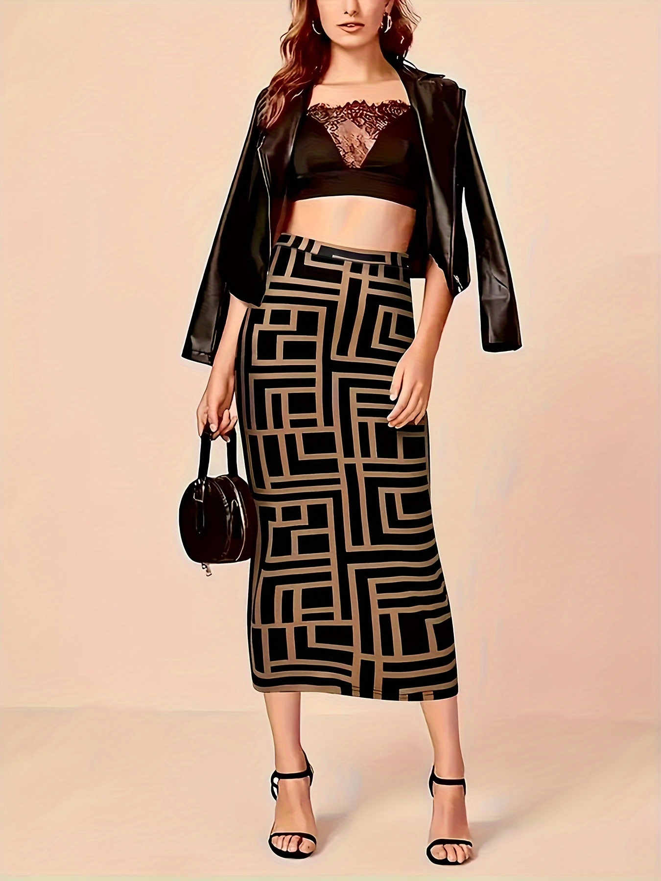 Elegant Black PU Leather High Waist Bodycon Midi Skirt For Women beige l