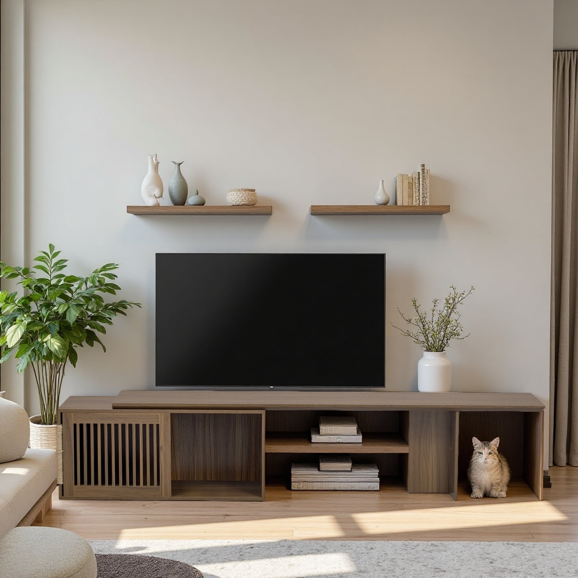 Modern Cream White TV Stand with Storage & Integrated Cat Litter Box Enclosure, Featuring Removable Sliding Door
